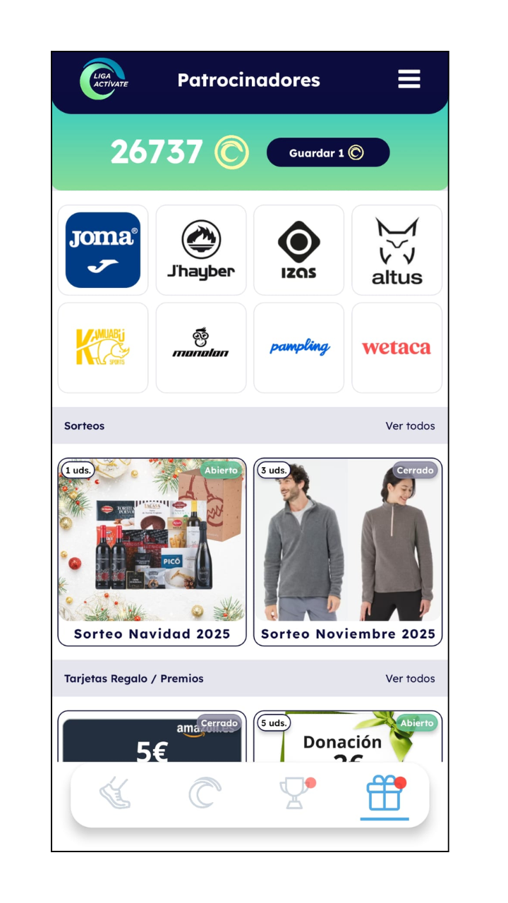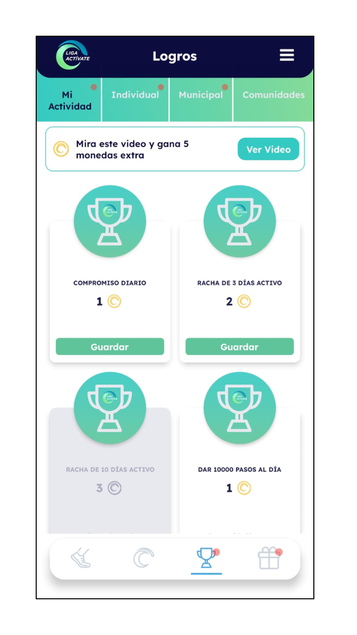 - Logros: Mi Actividad, Liga Individual, Municipios y Comunidades.